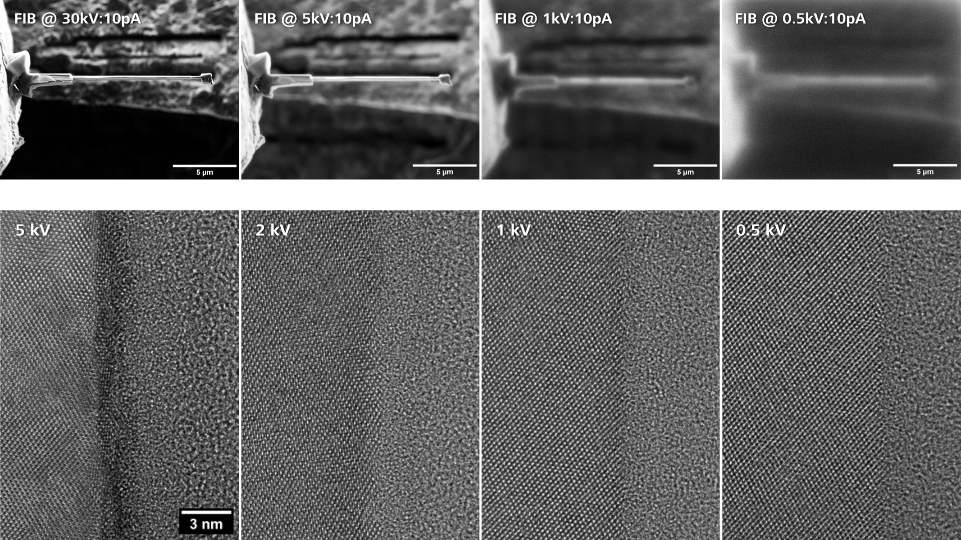 - The ZEISS ion column, designed for low-kV FIB processes, achieve minimal TEM sample amorphization with low kV FIB polishing